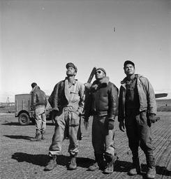 | Keywords: Ground crew sweats in a mission.jpg Photograph en Ground crew sweats in a mission Photograph shows three Tuskegee airmen looking skyward Ramitelli Italy March 1945 Source Photographer's note on contact sheet accession number LC-DIG-ppmsca-13271 digital file from original neg Call Number LC-F9-02-4503-330-12 item P P LOT 12447-1 Corresponding print Repository Library of Congress Prints and Photographs Division Washington D C 20540 USA Also available as contact sheet in LOT 12447-1 Title devised by Library staff Forms part of Toni Frissell Collection Library of Congress LOC-image ppmsca 13271 Rights Advisory No known restrictions on publication <gallery> Ground crew sweats in a mission 13271u tif tif </gallery> Toni Frissell http //www loc gov/rr/print/res/070_fris html 332d Fighter Group United States Army Air Forces Toni Frissell |