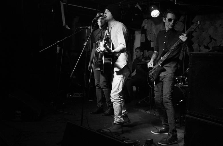 Keywords: group concert music sings microphone guitar light address by rock crowd