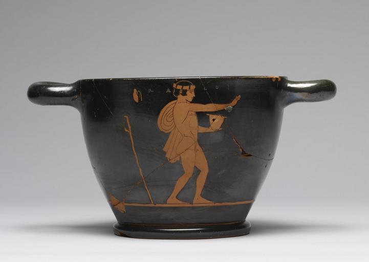 | Keywords: Group of Ferrara T981 - Red-Figure "Skyphos" with Dancer and "Komast" - Walters 482121 - Side B.jpg This skyphos a large drinking cup depicts a dancer and a komast a drunken reveler The dancer lunges to the right with extended arms while the komast stands in profile holding a skyphos These scenes of festivity are fitting for this vessel which was associated with the symposium men's drinking party This particular piece bears evidence of ancient repairs several copper-alloy clamps-some now broken-were used to join the pieces of the damaged vessel indicating the value of the skyphos to the owner even after it had lost its function of holding liquid ca 475 450 BC Classical terracotta copper alloy cm 13 9 27 5 with handles; Diam at mout cm 18 7 ; Diam at foot cm 12 1 accession number 48 2121 29016 Sale XVI Basel June 30 1956 no 132 Paul I Ilton date and mode of acquisition unknown The Paul I Ilton Collection Sale Hans M F Schulman New York November 21 1959 no 637 Walters Art Msueum 1959 by purchase Museum purchase with funds provided by the S and A P Fund 1959 inscription place of origin Attica Greece Walters Art Museum license Ancient Greek red-figure pottery in the Walters Art Museum Media contributed by the Walters Art Museum needs category review Group of Ferrara T981 Media contributed by the Walters Art Museum needs artist update Komos scenes Symposium scenes in ancient Greek pottery Kalos inscriptions |