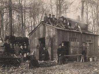 | Keywords: buildings group portraits groupportraits horses maple syrup industry maplesyrupindustry outdoor building architecture monochrome Photographer: Reuben R. Sallows (1855 - 1937) Description: Group portrait of twenty men and women in front of a sugaring shack; eight men and women sitting on roof; team of horses on right in background; bare trees in extreme background; title and date (1910/26) in pencil and Sallows stamp in blue ink on back Object ID : 0368-rrs-ogohc-ph View additional photographs by Sallows that are held in other collections at the Reuben R. Sallows Digital Library. Order a higher-quality version of this item by contacting the Huron County Museum (fee applies). Photographer: Reuben R. Sallows (1855 - 1937) Description: Group portrait of twenty men and women in front of a sugaring shack; eight men and women sitting on roof; team of horses on right in background; bare trees in extreme background; title and date (1910/26) in pencil and Sallows stamp in blue ink on back Object ID : 0368-rrs-ogohc-ph View additional photographs by Sallows that are held in other collections at the Reuben R. Sallows Digital Library. Order a higher-quality version of this item by contacting the Huron County Museum (fee applies). |