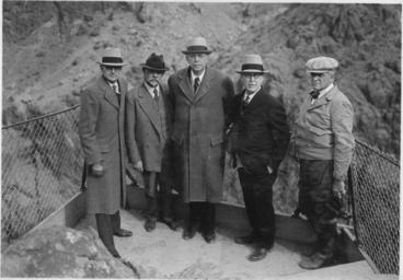 | Keywords: "Group of visitors photographed on Lookout Point with Construction Engineer Walker R. Young. Left to right, Walker R.... - NARA - 293645.jpg Scope and content Photograph from Volume Two of a series of photo albums documenting the construction of Hoover Dam Boulder City Nevada General notes 293645 Local identifier Department of the Interior Bureau of Reclamation Engineering and Research Center 05/18/1981 - 03/04/1988 NARA's Rocky Mountain Region Denver NRGA Building 48 Denver Federal Center West 6th Avenue and Kipling Street Denver CO 80225-0307 1932-04-12 Record group Record Group 115 Records of the Bureau of Reclamation 1889 - 2008 Record group ARC 444 Photograph albums compiled 1903 - 1972 Series ARC 293611 File unit File unit ARC Variant control numbers NAIL Control Number NRG-115-CONSTPHO85006-BC21178 Other versions <gallery> File Group_of_visitors_photographed_on_Lookout_Point_with_Construction_Engineer_Walker_R _Young _Left_to_right _Walker_R _-_NARA_-_293645 tif tif File Group_of_visitors_photographed_on_Lookout_Point_with_Construction_Engineer_Walker_R _Young _Left_to_right _Walker_R _-_NARA_-_293645 jpg jpg </gallery> NARA-cooperation PD-USGov People associated with the construction of Hoover Dam Young |