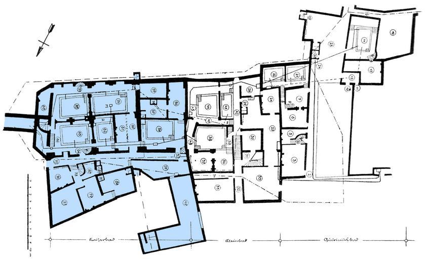 | Keywords: Grundriss oberer Badehauskomplex Aachen.jpg Grundriss des oberen Badehauskomplexes in Aachen bestehend aus Kaiserbad blau eingefärbt Kleinbad und Quirinusbad Oberstadtdirektor der Stadt Aachen Ed Bad Aachen seine Quellen und das Kaiserbad Aachen Kutsch ca 1964 p 12 1677 Adam Winants PD-old-100 Kaiserbad |