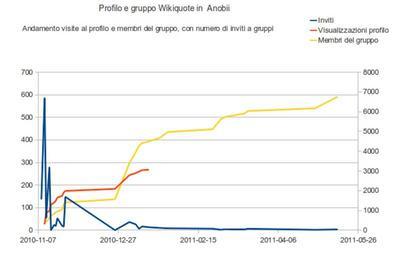 | Keywords: Gruppo Wikiquote di aNobii, andamento membri.png it Grafico del numero di visualizzazioni del profilo e di iscritti al gruppo di Wikiquote in italiano in aNobii correlati al numero di inviti In ordinata a sinistra inviti e visualizzazioni totali a destra gli inviti di quel giorno Fino al 12 novembre 2010 sono incluse migliaia di inviti a gruppi diversi da quello su Wikiquote da parte dell'utenza Wikiquote mentre in seguito gli inviti sono stati inviati prevalentemente da un'altra utenza own Nemo bis 2011-02-24 Cc-zero Wikiquote statistics Wikimedia Italia |