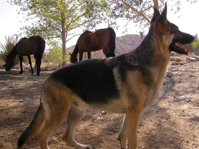 Keywords: GSD and horses.JPG German Shepherd with a couple of horses Own 2007-08-29 Dogperson3d Grazing horses German Shepherd Dog Male dogs Side views of dogs
