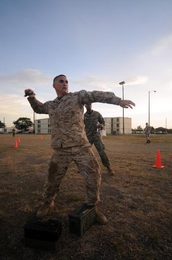 Keywords: GTMO Marines, Sailors, and Soldiers Perform a Combat Fitness Test DVIDS311062.jpg en Marine Corps Capt Robert Neman with Joint Task Force Guantanamo throws a dummy grenade during a Marine Combat Fitness Test Aug 18 The CFT is composed of three sections an 880-yard run ammo lifts and a maneuver-under-fire drill JTF Guantanamo provides safe humane legal and transparent care and custody of detainees including those convicted by military commission and those ordered released by a court The JTF conducts intelligence collection analysis and dissemination for the protection of detainees and personnel working in JTF Guantanamo facilities and in support of the War on Terror JTF Guantanamo provides support to the Office of Military Commissions to law enforcement and to war crimes investigations The JTF conducts planning for and on order responds to Caribbean mass migration operations 2010-08-18 Petty Officer 3rd Class Joshua Nistas https //www dvidshub net/image/311062 100818-N-+++++-179 2010-08-20 15 35 NAVAL STATION GUANTANAMO BAY CU PD-USGov-Military-Navy Naval Station Guantanamo Bay Joint Task Force Guantanamo Images from DoD uploaded by Fæ |
