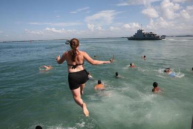 | Keywords: Guantanamo Bay activity DVIDS324506.jpg en Sailors Marines soldiers and airmen assigned to Joint Task Force Guantanamo perform the Gitmo jump-off as the base ferry gets underway transporting service members to the air terminal Service members jump from the pier next to the ferry landing to honor fellow service members and friends who are permanently leaving Naval Station Guantanamo Bay 2010-09-25 Petty Officer 1st Class David P Coleman https //www dvidshub net/image/324506 100925-N-+++++-003 2010-09-29 19 17 GUANTANAMO BAY CU PD-USGov-Military-Navy Naval Station Guantanamo Bay Joint Task Force Guantanamo Images from DoD uploaded by Fæ |