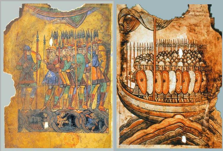 | Keywords: Guerande-vikings-1.jpg folio 7v s aubin défendant guérande folio 7r flotte normande Life of Saint Aubin / Miracula Sancti Albini / Vie de Saint Aubin created in the XIe - From abbaye de Angers France - BNF unknown - died before 1200 all - public domain 0 PD-old knots in art and decoration Guérande Normans Miracula Sancti Albini Viking ships in art Vikings in art |