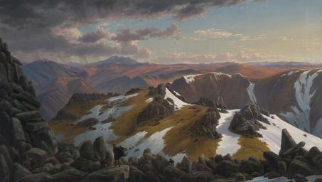 | Keywords: Guerard Mount Townsend 1863.jpg North-east View from the Northern Top of Mount Kosciusko http //www nga gov au/OutandAbout/Texts/48469 htm 1863 Oil on canvas National Gallery of Australia creator Eugene von Guerard m 66 5 116 8 accession number 48469 object history ProvenanceEvent purchase 1973 19th-century mountain paintings Guerard Mount Townsend 1863 Eugene von Guerard Art of Australia Paintings in the National Gallery of Australia Mount Townsend Kosciuszko National Park 1860s landscape paintings Landscape paintings of Australia 1863 oil on canvas paintings PD-Australia |