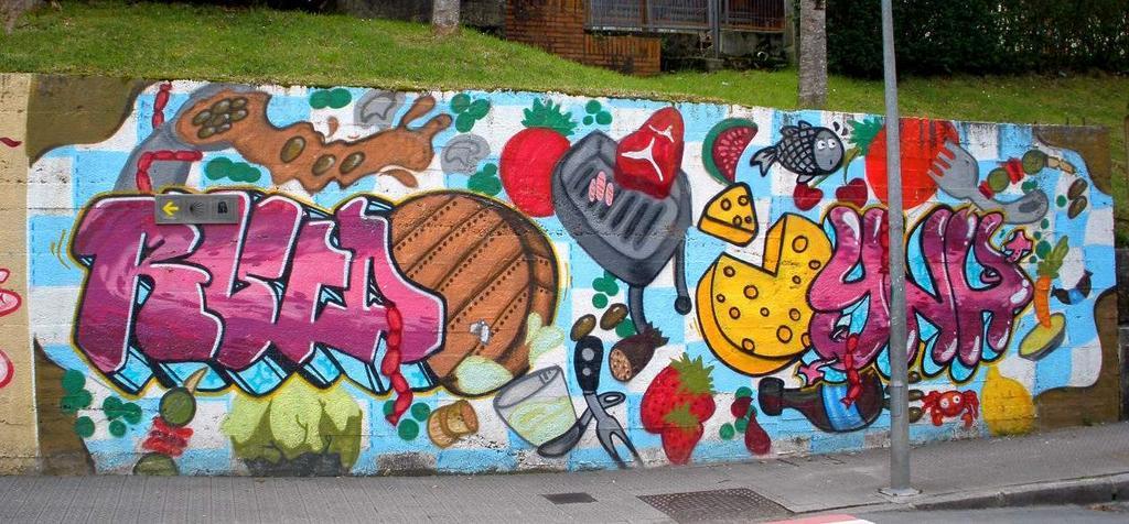 Keywords: Guernica - Calle de Zearreta, graffiti 01.jpg en Graffiti in Gernika own Zarateman 2011-04-17 Cc-zero Graffiti in Gernika Graffiti of fruits Graffiti of food Graffiti of fishes Graffiti of cheese