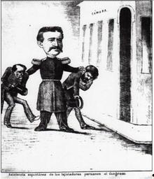 | Keywords: Guerra del pacífico 1879-1884 Caricatura 80.jpg es Patricio Ibarra Cifuentes escribió Una vez en el poder Francisco García Calderón presidente provisional del Perú electo bajo la supervisión de las fuerzas de ocupación chilenas convocó la reunión de un Congreso con el objeto de retomar cierta normalidad en la vida cívica del Perú y de ese modo iniciar el camino hacia la obtención de la paz con Chile No obstante la división interna de la clase política peruana unos partidarios de García Calderón y otros del ex dictador Nicolás de Piérola significó la creación de dos congresos distintos en Chorrillos y Ayacucho respectivamente El primero de ellos tuvo graves problemas de quórum debido al poco interés demostrado por la causa de García Calderón asociada no sin razón a una suerte de servilismo hacia los intereses de los chilenos A propósito de la inasistencia de los congresistas esta caricatura publicada en El Padre Cobos el 2 de junio de 1881 muestra al general en jefe chileno Pedro Lagos llevando por las orejas a dos representantes a una sesión del cuerpo legislativo 1879-1884 http //www tesis uchile cl/tesis/uchile/2009/ibarra_pa/html/TH 4 html Chilean magazines El Ferrocarrilito El Padre Cobos El Diablo José Peluca El Barbero El Corvo Padre Padilla Diógenes other versions PD-old-70-1923 Chilean Caricatures in the War of the Pacific |