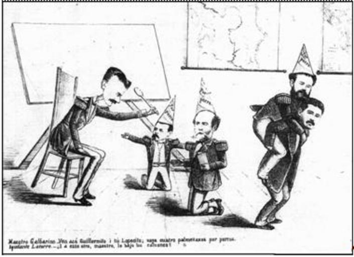 | Keywords: Guerra del pacífico 1879-1884 Caricatura 19.jpg en Patricio Ibarra Cifuentes escribe Esta sátira de El Barbero del 1º de noviembre de 1879 muestra al jefe de la escuadra comandante Galvarino Riveros como un profesor que reprende al almirante Juan Williams Rebolledo y al capitán Juan Esteban López por su mal desempeño cuando ellos estuvieron a cargo de la flota chilena Por su parte Juan José Latorre comandante del blindado Cochrane en el rol de ayudante de Riveros lleva en sus hombros al presidente del Perú Mariano Ignacio Prado y pregunta si es menester castigarlo también 1881 http //www tesis uchile cl/tesis/uchile/2009/ibarra_pa/html/index-frames html Caricaturas chilenas de la Guerra del Pacífico 1879-1884 La presente monografía presenta un análisis e interpretación de 105 caricaturas publicadas en periódicos humorísticos chilenos inspiradas en las causas desarrollo y consecuencias de la Guerra del Pacífico enfrentamiento armado que Chile llevó adelante contra la alianza formada por Perú y Bolivia durante los años 1879 y 1884 Divididos en seis categorías temáticas los grabados seleccionados muestran como los editores de los rotativos y sus dibujantes señalaron su particular punto de vista aportando con ello a la discusión pública emanada desde la prensa a propósito del conflicto del norte Asimismo se presenta un sucinto estudio de los diarios de sátira que vieron la luz mientras se llevaban a cabo las hostilidades caracterizándolos y ubicándolos a partir de la posición que ocuparon en el espectro político de la época http //www tesis uchile cl/tesis/uchile/2009/ibarra_pa/html/index-frames html http //www repositorio uchile cl/handle/2250/108555 Compiladas por Ibarra Cifuentes Patricio other versions PD-Art Chilean Caricatures in the War of the Pacific |