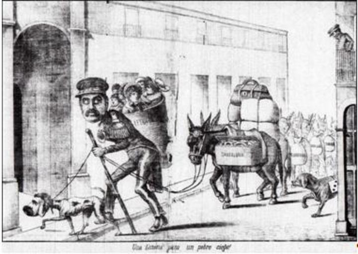 Keywords: Guerra del pacífico 1879-1884 Caricatura 88.jpg es Patricio Ibarra Cifuentes escribió Una limosna para un pobre ciego pide irónicamente el periódico José Peluca en esta caricatura del 10 de mayo de1884 El general en jefe de la ocupación de Lima Patricio Lynch con los ojos cerrados y apoyándose en un báculo es conducido por un perro-guía caracterizado como el presidente Domingo Santa María Lynch en su espalda porta un saco lleno de mujeres denominado como efectos refiriéndose a las múltiples damas limeñas encantadas con el trato dado por el militar chileno Asimismo conduce una recua de mulas donde transporta toda la chafalonía especies y el dinero recaudado por los numerosos cupos de guerra impuestos durante toda la guerra José Peluca el personaje homónimo del periódico observa la escena desde un balcón 1879-1884 http //www tesis uchile cl/tesis/uchile/2009/ibarra_pa/html/TH 4 html Chilean magazines El Ferrocarrilito El Padre Cobos El Diablo José Peluca El Barbero El Corvo Padre Padilla Diógenes other versions PD-old-70-1923 Chilean Caricatures in the War of the Pacific