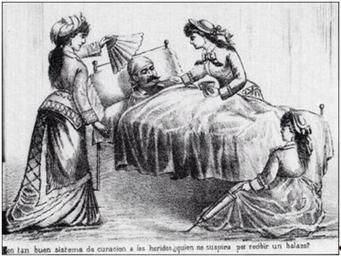 | Keywords: Guerra del pacífico 1879-1884 Caricatura 89.jpg es Patricio Ibarra Cifuentes escribió Visión idealizada de El Barbero respecto de los cuidados brindados a los heridos en los hospitales y ambulancias chilenas Esta caricatura muestra a un soldado chileno disfrutando de los solícitos cuidados de tres gentiles damas mientras se pregunta que a quién no le gustaría resultar herido con tan buen sistema de curación Sin embargo la realidad era otra Pese a los esfuerzos de médicos y enfermeras tanto en los hospitales como en las ambulancias las deficiencias en la administración y organización de los recursos redundaba en la mala atención al personal lastimado 1879-1884 http //www tesis uchile cl/tesis/uchile/2009/ibarra_pa/html/TH 4 html Chilean magazines El Ferrocarrilito El Padre Cobos El Diablo José Peluca El Barbero El Corvo Padre Padilla Diógenes other versions PD-old-70-1923 Chilean Caricatures in the War of the Pacific |