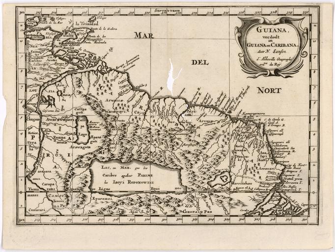 | Keywords: Guiana and Caribana WDL11336.png Artwork ru Сансон иколас 1600-1667 fr Sanson Nicolas 1600-1667 en Sanson Nicolas 1600-1667 zh 桑 尼古拉斯 1600-1667 pt Sanson Nicolas 1600-1667 ar سانسون، نيكولاس 1600-1667 es Sanson Nicolas 1600-1667 ru Гвиана и Ка ибана fr Guyana et Caribana en Guiana and Caribana zh 亚那和卡瑞巴纳 pt Guiana e Caribana ar غويانا وكاريبانا ru Эта ка та части севе ного побе ежья Южной Аме ики является голландским изданием ка ты изначально составленной около 1650 года иколасом Сансоном 1600 1667 гг геог афом п и дво е ко олей Людовика XIII и Людовика XIV кото ого считают отцом ф анцузской ка тог афии В начале XVIII века вышло множество изданий являющихся копией ка ты Сансона а ка те изоб ажен егион от ост ова Т инидад и устья еки О иноко на западе до устья еки Амазонки на юго-востоке Сансон под азделяет эту область на овую Андалусию Гвиану и Ка ибану и пе ечисляет населяющие егион ко енные племена Инте ес ев опейцев к этому егиону подстегнула публикация оче ка сэ а Уолте а Рейли <em> Отк ытие большой богатой и к асивой импе ии Гвиана </em> появившегося в 1596 году В 1595 году Рейли сове шил экспедицию вве х по еке О иноко в поисках легенда ного ко олевства Эльдо адо Считалось что оно асполагается на бе егах большого водоема известного как озе о Па има а этой ка те показано озе о обязанное своим названием племени ка ибов Тот факт что мистического озе а не существует был достове но доказан только в XIX веке <br> иде ланды - Колонии; Испания Колонии fr Cette carte d'une partie de la côte septentrionale de l'Amérique du Sud est une version néerlandaise d'une carte produite initialement vers 1650 par Nicolas Sanson 1600-1667 géographe royal des rois Louis XIII et Louis XIV communément surnommé le père de la cartographie française De nombreuses éditions copiées à partir de l'exemplaire de Sanson ont été imprimées au début du XVIII<sup>e</sup> siècle La carte couvre la région de l'île de Trinidad et l'embouchure du fleuve Orénoque à l'ouest jusqu'à l'embouchure du fleuve Amazone au sud-est Sanson divise cette zone en trois parties Nouvelle Andalousie Guyana et Caribana Il indique également les noms des peuples autochtones vivant dans la région L'intérêt des Européens pour cette région fut suscité par la publication de l'ouvrage de Sir Walter Raleigh <em>Découverte du grand riche et bel empire de la Guyana</em> en 1596 Raleigh avait monté une expédition en 1595 pour remonter l'Orénoque à la recherche du légendaire royaume de l'Eldorado Ce royaume était censé se situer sur les rives d'une vaste étendue d'eau appelée le lac Parime Cette carte montre le lac et attribue son nom au peuple Caraïbe La non-existence de ce lac mythique fut définitivement prouvée au XIX<sup>e</sup> siècle <br>Pays-Bas--Colonies; Espagne--Colonies en This map of part of the northern coast of South America is a Dutch version of a map originally produced around 1650 by Nicolas Sanson 1600 1667 royal geographer to Kings Louis XIII and XIV and commonly known as the father of French cartography Numerous editions copied from Sanson were printed in the early 18th century The map covers the region from the island of Trinidad and the mouth of the Orinoco River in the west to the mouth of the Amazon River in the southeast Sanson divides this area into New Andalusia Guiana and Caribana and gives the names of the indigenous peoples inhabiting the region European interest in this region was spurred by the publication in 1596 of Sir Walter Raleigh s <em>The Discovery of the Large Rich and Beautiful Empire of Guiana</em> Raleigh had made an expedition in 1595 up the Orinoco River in search of the legendary kingdom of El Dorado The kingdom was believed to be located on the shores of a large body of water known as Lake Parime This map shows the lake and attributes its name to the Carib people The nonexistence of the mythical lake was not definitively proven until the 19th century <br>Netherlands--Colonies; Spain--Colonies zh 这张 图显示了南美洲北部海岸的 部分,是 张荷兰文 图, 早由尼古拉斯·桑 (Nicolas Sanson,1600-1667 年) 1650 年左右制 完成,桑 是法王路易十三 Louis XIII 和路易十四 Louis XIV 的皇家 理学家,被称为法国制图之父 18 世纪 , 众多复制桑 版 的 图出版 这张 图涵盖了从特立尼达岛和奥里诺科河西部河口到亚马 河 南部河口的 区 桑 将此区域划分成新安达卢西亚 亚那和卡瑞巴纳三部分,并标出了居住 该 区的 著部族名称 1596 年,沃尔特·罗利爵士 Sir Walter Raleigh 出版了<em> 发现广阔 富饶和美丽的 国 亚那 </em>, 发了欧洲人对这 区的兴趣 1595 年,罗利对奥里诺科河上游进行了 次探险,寻找传说中的埃尔多拉多王国 据说这个王国位于 个称为帕里梅湖的大湖旁边 这张 图上显示了这个湖泊,并指其名称 自加勒比人 直到 19 世纪,这个神秘湖泊才被明确证实并不存 <br>荷兰-殖民 ; 西班牙-殖民 pt Este mapa de parte da costa norte da Am