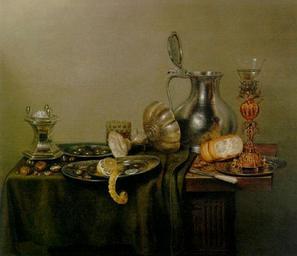 | Keywords: Guilliam Gabron-still life1.jpg title A silver salt-cellar and upturned tazza a pewter flagon a roemer on a silver-gilt stand a peeled lemon on a pewter plate http //www artnet com/WebServices/picture aspx date 19991217 catalog 11425 gallery 110884 lot 00014 filetype 2 Guilliam Gabron 1644 Oil on panel in 33 3 38 2 PD-old-100 Baroque still life paintings Salt in art 1644 paintings 1640s still life paintings 17th-century paintings location missing 17th-century oil on panel paintings Paintings of silverware Still life paintings of tableware Peeled lemons in art Salt containers tableware Still life paintings of bread Gerret Willemsz. Heda - Still life with nuts, olives, a lemon, a piece of bread and decorative crockery on a wooden table.jpg title A silver salt-cellar and upturned tazza a pewter flagon a roemer on a silver-gilt stand a peeled lemon on a pewter plate http //www artnet com/artists/guilliam-gabron/a-silver-salt-cellar-and-uptruned-tazza-a-pewter-NN_MRhs8gB--K0nnrKU6aQ2 artnet Creator Gerret Willemsz Heda Formerly attributed to 1646 Christie's London England 1999-12-17 lot 14 as Willem Gabron https //rkd nl/explore/images/62914 Now attributed to Gerret Willemsz Heda Oil on panel in 33 3 38 2 signed and dated center right Gerret HedA 1646 PD-old-100 Gerret Willemsz Heda Baroque oil still-life paintings Salt in art 1646 paintings 1640s still life paintings 17th-century paintings location missing 17th-century oil on panel paintings Paintings of silverware Still-life paintings of tableware Peeled lemons in art Salt containers tableware Still-life paintings of bread |