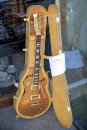 Keywords: guitar electric case shop window pawn music instrument string brown tan gibson 50th anniversary musical play musician guitarist performer pick power tune equipment sale