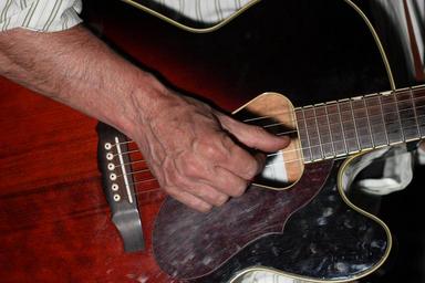 Keywords: guitar player hand music musician instrument guitarist performer veins hairy acoustic arm strings