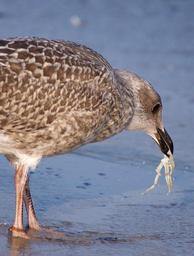 Keywords: gull young bird fish crabs bill eat beach water sea wave animal bird food