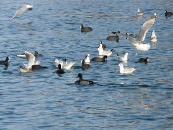 Keywords: gulls ducks coots water scrum feeding hustle and bustle