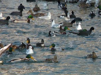 Keywords: gulls ducks coots water scrum feeding hustle and bustle