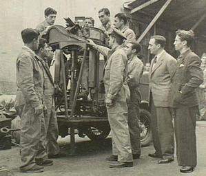 | Keywords: Gun turret instruction.jpg Middle East 22 June 1943 An RAF instructor instructing a class of Turkish airmen on the operation of a gun turret The gun turret has been removed from an aircraft and stripped so that the class may study the operation of the mechanism These airmen will be qualified to give instruction to their comrades in Turkey when they have completed their course in the Middle East Squadrons of the Turkish Air Force are being equipped with British aircraft of various types Bombers and fighters are being sent to airfields in Turkey in increasing numbers The aircraft are assembled on landing grounds in the Middle East and flown to their destinations by pilots of the Turkish Air Force The pilots are given refresher courses at RAF training centres before they take over the aircraft http //cas awm gov au/item/MED1454 Australian War Memorial 1943-06-22 Author Removed AWM stamp in lower right corner with Gimp PD-Australia Categories Aircraft gun turrets Aviation training in World War II Weapon training Military training in Turkey |