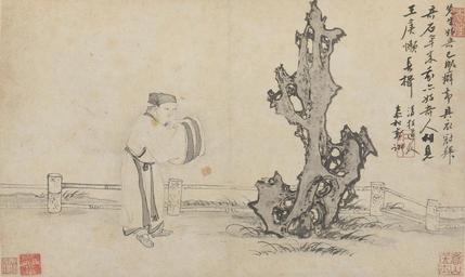 | Keywords: Guo Xu album dated 1503 (9).jpg The scholar-artist Mi Fu was an eccentric of the eleventh century and one of the four great calligraphers of the Song dynasty It was well-known that he had a peculiar admiration for certain rocks In this period men of culture collected and placed in their gardens rare and unusual rocks from Lake Tai which had become pitted and worn by the actions of wind and waves over many centuries Mi Fu believed that some these rocks had their own souls and he was in the habit of paying them his respects by bowing before them as if they were venerable old gentlemen Chester Beatty Library Dated 1503 Album leaf; ink and colors on paper 29 8 × 49 3 cm Shanghai Museum http //www cbl ie/china/Item aspx itemId 18 ˜Mi Fu bowing to a rock ™ Dublin Chester Beatty Library object history exhibition history credit line This is one of eleven paintings comprising an album <gallery> File Guo Xu album dated 1503 1 jpg ˜Fuxi the maker of men ™ File Guo Xu album dated 1503 2 jpg ˜Shennong the divine farmer ™ File Guo Xu album dated 1503 3 jpg ˜Drunken immortal ™ File Guo Xu album dated 1503 4 jpg ˜Immortal Qiu ™ File Guo Xu album dated 1503 5 jpg ˜Seeking a suitable phrase ™ File Guo Xu album dated 1503 6 jpg ˜An old lady feeds a hero ™ File Guo Xu album dated 1503 7 jpg ˜Immortal Ge spitting fire ™ File Guo Xu album dated 1503 8 jpg ˜Playing a flute riding a buffalo ™ File Guo Xu album dated 1503 9 jpg ˜Mi Fu bowing to a rock ™ File Guo Xu album dated 1503 10 jpg ˜Northern frontier ™ File Guo Xu album dated 1503 11 jpg ˜The Creation of the Milky Way ™ </gallery> accession number place of creation China during the Ming dynasty http //www cbl ie/china/ Telling Images of China exhibit Dublin Chester Beatty Library <small><small>http //www cbl ie/china/app_themes/exhibit/img/exhibits/large/img9-9 jpg direct link </small></small> PD-Art-100 Mi Fu Scholar's rocks |
