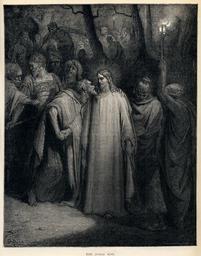| Keywords: Gustave Doré - The Holy Bible - Plate CXLI, The Judas Kiss.jpg The Judas Kiss Mark 14 45 by Gustave Doré Judas kisses Jesus in order to betray him to the guards The Holy Bible Containing the Old and New Testiments According to the Authorised Version With Illusrations by Gustave Doré Cassell / Company Limited London Paris Melbourne The first edition was 1866 This edition is probably from about that time - may well be a first edition - but in any case is certainly not later than 1900 or so Gustave Doré 1832-1883 The Pannemaker in the lower right refers to Adolphe François Pannemaker 1822-1900 one of Doré's assistants in turning his art into a full-fledged engraving and a reasonably notable engraver in his own right PD-Old File Gustave Doré - The Holy Bible - Plate CXLI The Judas Kiss png Archival PNG Levels adjustment dirt and scratch removal rotation etc Original scan at File Gustave Doré - The Holy Bible - Plate CXLI The Judas Kiss unadjusted png assessments 1 The Judas Kiss Art depicting the New Testament by Gustave Doré Engravings of the Capture of Jesus Christ 1866 engravings People with torches in art |
