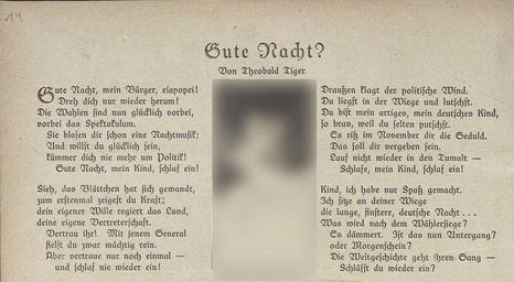 Keywords: Gute Nacht-Ulk1919 014.jpg de Ulk Jahrgang 48 Nummer 5 Seite 14 31 Januar 1919 ulk1919 014 Creator Kurt Tucholsky 1919 Kurt Tucholsky De Wikisource book leaflet PD-old