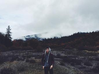 Keywords: guy hoodie mountains forest trees nature clouds outdoors landscape people lifestyle