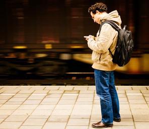 Keywords: guy platform train station person man male waiting commuter smartphone typing public transport communication texting traveler