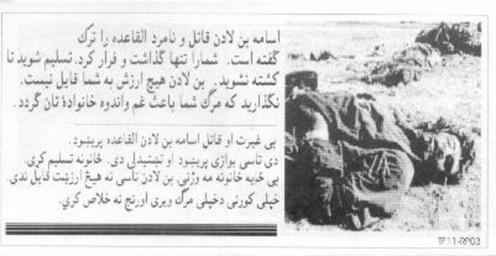 | Keywords: GWOT Demoralization Leaflet TF11RP03 back.jpeg en Back of US Government leaflet meant to demoralize Taliban and Al-Qaeda by showing they were dying as Osama Bin Laden deserted them 2002-01 http //www psywarrior com/DivideandConquer html Federal Government PD-USGov Government propaganda Uploaded with UploadWizard |
