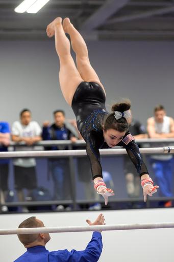 Keywords: gymnastics female performance uneven bars exercise somersault fitness woman strength poise athlete competition spotter college liz copan