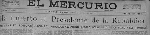 | Keywords: Ha muerto el Presidente de la República (Pedro Aguirre Cerda), El Mercurio.jpeg es Fragmento de la portada del diario El Mercurio del 26 de noviembre de 1941 Ha muerto el Presidente de la República Pedro Aguirre Cerda http //ww2 educarchile cl/UserFiles/P0001/Image/CR_Imagen/articles-104531_imagen_0 jpeg El Mercurio 1941-11-26 PD-Chile Files uploaded by Diego Grez-Cañete El Mercurio in 1941 Pedro Aguirre Cerda El Mercurio front pages | ||||