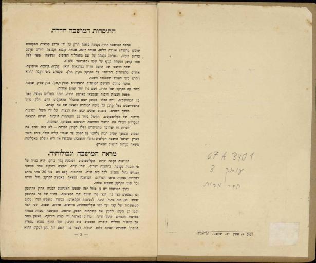 Keywords: Hadera-The colony status and development by Zvi Botkovsky H OP 003b.png מפה ש המושבה חדרה משנת - 1926 חוברת ובה תיאור המוסדות ותה יך ההתיישבות http //primo nli org il/primo_library/libweb/action/dlDisplay do vid NLI docId NNL_ALEPH001838258 חדרה מצב המושבה בהוה ודרכי התפתחותה בצרוף מפה כ ית ומפרטת /מאת צבי בוטקובסקי 1926 זוהי מפה ש אדמות המושבה חדרה וסביבותיה המפה מצורפת חוברת שנכתבה ונערכה ע ידי צבי בוטקובסקי המוגדר כ חוקר תו דות חדרה בשנת 1926 בחוברת מתוארי מוסדות המושבה בית הספר הגני תחנת הרכבת השיטור השטחי החק איי והקשר ע הבנקי אגודות חק איות שיתופיות עוד כמו כן החוברת מסתיימת במעין משא ת ב וצפי ש המחבר גבי עתידה ש חדרה המפה מתארת את חדרה המושבה את השטחי הסמוכי ה המפה הוכנה ע ידי ועד המושבה חדרה ג כן בשנת 1926 Hadera The colony status and development publication and a general map and lists / by Zvi Botkovsky 1926 This is a map of the Hadera colony in Israel and its surroundings A map is attached to the booklet written and edited by Botkovsky in which he describes the settlement institutions school parks train station police agricultural areas and the relationship with the banks cooperative agricultural associations and more The booklet also ends in a kind of wishful thinking and the author's expectation for the future of Hadera own Zvi Botkovsky from the collections of the National Library of Israel PD-old GLAM National Library of Israel Hadera The colony status and development 1926 |