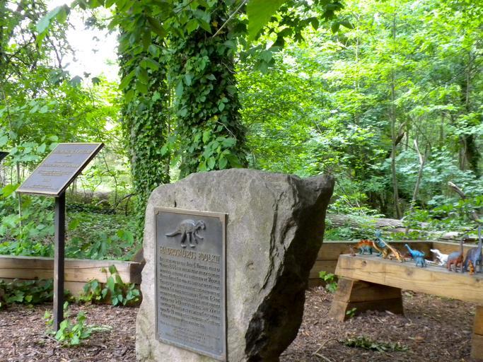 | Keywords: Hadrosaurus Foulkii.JPG 94001648 en Hadrosaurus Foulkii Leidy Site a National Historic Landmark since October 12 1994 At the east end of Maple Ave near Cooper River in Haddonfield New Jersey Near this site about 20 yards The first fairly complete dinosaur skeleton was discovered in 1858 It was also the first mounted dinosaur skeleton From left NHL plaque Plaque from Philadelphia Academy of Sciences toy dinosaurs apparently left by visitors to the site certainly not by me or perhaps by neighborhood kids own Smallbones 2010-05-11 39 54 34 N 75 1 40 W Hadrosaurus Foulkii Leidy Site |