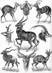 | Keywords: Haeckel Antilopina.jpg right 250px Tetracerus quadricornis <small> Blainville </small> Tetracerus quadricornis <small> Blainville 1816 </small> Catoblepas gnu <small> Sundevall </small> Connochaetes gnou <small> Zimmermann 1780 </small> Tragelaphus gratus <small> Sclater </small> Tragelaphus spekii gratus <small>P L Sclater 1880</small> Antilocapra americana <small> Owen </small> / Antilope furcifera <small> Smith </small> Antilocapra americana <small>Ord 1815</small> Antilope ellipsiprymna <small> Gray </small> / Cervicapra ellipsiprymna <small> Sundevall </small> Kobus ellipsiprymnus <small> Ogilby 1833 </small> Hippotragus niger <small> Harris </small> Hippotragus niger <small>Harris 1838</small> Addax nasomaculatus <small> Gray </small> Addax nasomaculatus <small> Blainville 1816 </small> Tragelaphus kudu <small> Gray </small> / Antilope strepsiceros <small> Pallas </small> Tragelaphus strepsiceros <small> Pallas 1766 </small> Tragelaphus scriptus <small> Sundevall </small> / Antilope maculata <small> Pallas </small> Tragelaphus scriptus <small> Pallas 1766 </small> English <br /> 1 Four-horned Antelope<br /> 2 Black Wildebeest<br /> 3 Sitatunga<br /> 4 Pronghorn<br /> 5 Waterbuck<br /> 6 Sable Antelope<br /> 7 Addax<br /> 8 Greater Kudu<br /> 9 Bushbuck<br /> Deutsch <br /> 1 Vierhornantilope<br /> 2 Wildebeest / Gnu Haeckel Weißschwanzgnu Modern <br /> 3 Sumpfantilope Haeckel Wald-Sitatunga Modern <br /> 4 Gabelantilope Haeckel Gabelbock Modern <br /> 5 Wasserbock<br /> 6 Schwarzbock Haeckel Rappenantilope Haeckel/Modern <br /> 7 Mendesantilope<br /> 8 Kudu-Antilope Haeckel Großer Kudu Modern <br /> 9 Schirrantilope Haeckel Buschbock Modern <br /> Native names <br /> 1 Bherki India <br /> 2 Imbutuma Africa <br /> 3 Situtunga Africa <br /> 4 Mazama North America <br /> 5 Singsing Africa <br /> 9 Gulungu Africa <br /> Kunstformen der Natur 1904 plate 100 Antilopina see http //caliban mpiz-koeln mpg de/haeckel/kunstformen/high/Tafel_100_300 html here http //caliban mpiz-koeln mpg de/haeckel/kunstformen/high/Tafel_100_text_1_200 html here and http //caliban mpiz-koeln mpg de/haeckel/kunstformen/high/Tafel_100_text_2_200 html here creator Ernst Haeckel 1904 public domain due to age Haeckel Antilopina Addax nasomaculatus jpg Haeckel Antilopina Sitatunga jpg Haeckel Antilopina Tetracerus quadricornis jpg Haeckel Antilopina - Tragelaphus scriptus jpg PD-old Kunstformen der Natur 1904 Ruminantia Wildebeests in art Antilocapra americana Kobus ellipsiprymnus Hippotragus niger Kudus in art |