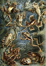 | Keywords: Haeckel Batrachia.jpg Assessments 1 in German <gallery> Image Haeckel frogs text jpg </gallery> English translation Remarks made by the translator are in italics or square brackets<br/> Fig 1 The pouch frog of Venezuela is remarkable for its female's possession of a paired dorsal <nowiki>back</nowiki> pouch in which the eggs remain until the hatching of the tadpoles A narrow triangular gap at the rear of the back in the centre of the lightly coloured saddle patch leads to the pouch <br/> Fig 2 Mediterranean Tree Frog Stripeless Tree Frog<br/> The treefrog of North Africa and Southern Europe is little different from our native common green treefrog Hyla arborea and like the latter lives on trees and shrubs When crying <nowiki>calling</nowiki> the male pushes forward the vocal sac like a bubble <br /> Fig 3 The treefrog of Ecuador is characterised by the crude build of its thick fingers with very wide contact plates and the knobbly skin that like in toads is covered in glandular warts <br /> Fig 4 The climbing frog of Ecuador is among the slimmest and most supple forms of treefrogs; his extraordinarily thin and long limbs with zebralike dark stripes across enable it of the most dexterous climbing arts <br /> Fig 5 The flying frog of Borneo is remarkable above all other Batrachids for its extraordinarily widened foot webbings between the elongated toes If the flying frog spreads these webs while jumping from tree to tree he can use them as a parachute similar to the flying dragon Draconellus among the reptiles Plate 79 and the flying squirrels Pteromys among the rodents <br /> Fig 6 The military frog of Surinam is very peculiar in that the female carries its young on its back in military rank The little tadpoles numbering 12 to 20 attach to two diverging back ridges of the mother that run symmetrically either side of the dorsal central line by their oral suction plates The mobile rudder tails are turned outward on the left side as on the right <br /> Fig 7 The banded frog of Java has two parallel white bands on its back running lengthwise that contrast strongly against the dark red brown base colour The jumping treefrog is about to capture an insect with its protruded bicornuated tongue <br /> Fig 8 The tip frog from the Solomon Islands is assigned to the group of horn frogs that are distinguished by a pair of sharp horns on top of the triangular head; these are elongated coverings of the upper eye lids The bright colouration and patterning of this horn frog is most variable and often adapted to its environment <br /> Fig 9 The thickhead frog from East Africa Mozambique Sambesi deviates from all other frogs in the appearance of its very short and thick head Furthermore it cannot jump with its short and weak legs and moves its fat crude body only with difficulty The hind feet have large spade-like digging swellings that help it to rapidly dig itself into the soil It feeds on termites and in its subterranean habits is equal to the moles <br /> Fig 10 Northern Leopard Frog<br /> The piping frog of North America Right behind the eye one can see the large white entirely superficially positioned eardrum Kunstformen der Natur 1904 plate 68 Batrachia see http //caliban mpiz-koeln mpg de/haeckel/kunstformen/high/Tafel_068_300 html here http //caliban mpiz-koeln mpg de/haeckel/kunstformen/high/Tafel_068_text_1_200 html here and http //caliban mpiz-koeln mpg de/haeckel/kunstformen/high/Tafel_068_text_2_200 html here Ernst Haeckel 1904 PD-old <gallery>File Haeckel frogs with labels jpg</gallery> Haeckel Batrachia L lineatus jpg Hylarana erythraea Haeckel png Hylarana erythraea Haeckel 2 png Haeckel Gastrotheca ovifera jpg Kunstformen der Natur 1904 Paintings of frogs Neobatrachia Gastrotheca ovifera Hyla meridionalis Ecnomiohyla tuberculosa Gastrotheca guentheri Rhacophorus pardalis Leptodactylus lineatus Hylarana erythraea Ceratobatrachus guentheri Breviceps mossambicus Lithobates pipiens |