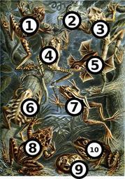 | Keywords: Haeckel frogs big spots.jpg Labels for Image Haeckel Batrachia jpg Original is public domain <nowiki> PD-old </nowiki> and this version I am oh so generously giving to the public domain also Made with Inkscape and the GNU Image Manipulation Program It's crude and I hope someone else does a better job with silhouettes or names around the borders or something You learn better when there's a closer association between image and text But in the meantime it's more visible than the tiny labels on the Haeckel_frogs_with_labels jpg This is duplicated on en wikipedia Image Haeckel frogs big spots jpg where you'll get proper blue/red links s Notodelphys ovifera Weinland now Gastrotheca ovifera Lichtenstein Weinland 1854; name revision by Rivero 1961 Hyla meridionalis Boulenger authority usually given as Boettger 1874 Hyla tuberculosa Boulenger now Ecnomiohyla tuberculosa Amphignathodon Güntheri or Amphignathodon guntheri Boulenger now Gastrotheca guentheri Boulenger 1882; name revision by Duellman Maxson Jesiolowski 1988 Rhacophorus pardalis Wallace authority usually given as Günther 1858 Hylodes lineatus Schneider now Craugastor lineatus Brocchi 1879 Limnodytes erythraeus Duméril now Hylarana erythraea Schlegel 1837 Cerathobatrachus Güntheri or Ceratobatrachus guentheri Boulenger Breviceps mossambicus Peters Rana pipiens Linné now Lithobates pipiens PD-old Ernst Haeckel image keys |