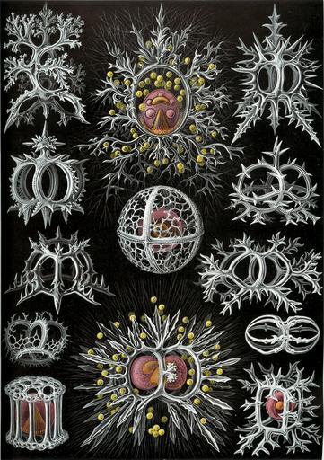 Keywords: Haeckel Stephoidea.jpg Assessments 1 top center Lithocircus magnificus <small> Haeckel </small> Lithocircus sp living animal top left Semantis sigillum <small> Haeckel </small> Tholospyris procera <small>Goll 1969</small> skeleton of juvenile bottom left upper Acanthodesmia corona <small> Haeckel </small> Acanthodesmia sp skeleton center right upper Tristephanium dimensivum <small> Haeckel </small> Tristephanium dimensivum <small>Haeckel 1887</small> skeleton center Trissocyclus sphaeridium <small> Haeckel </small> Trissocyclidae sp living animal center right lower Octotympanum cervicorne <small> Haeckel </small> Acanthodesmia viniculata <small> Müller 1857 </small> skeleton bottom right upper Microcubus zonarius <small> Haeckel </small> Amphispyris zonarius <small> Haeckel 1887 </small> skeleton top right Tympaniscus tripodiscus <small> Haeckel </small> Trissocyclidae sp skeleton center left upper Tympaniscus quadrupes <small> Haeckel </small> Trissocyclidae skeleton bottom center Tympanidium foliosum <small> Haeckel </small> Tympanidium foliosum <small>Haeckel 1887</small> living animal bottom left lower Lithotympanum tuberosum <small> Haeckel </small> Lithotympanum tuberosum <small>Haeckel 1887</small> living animal center left lower Circotympanum octogonium <small> Haeckel </small> Nassellaria sp </small> skeleton bottom right lower Lithocubus astragalus <small> Haeckel </small> Lithocubus ap living animal Kunstformen der Natur 1904 plate 71 Stephoidea see http //caliban mpiz-koeln mpg de/haeckel/kunstformen/high/Tafel_071_300 html here http //caliban mpiz-koeln mpg de/haeckel/kunstformen/high/Tafel_071_text_1_200 html here and http //caliban mpiz-koeln mpg de/haeckel/kunstformen/high/Tafel_071_text_2_200 html here creator Ernst Haeckel 1904 public domain due to age <gallery>File Haeckel Stephoidea edit jpg Edited for dust contrast and uneven border</gallery> PD-old Kunstformen der Natur 1904 Radiolaria