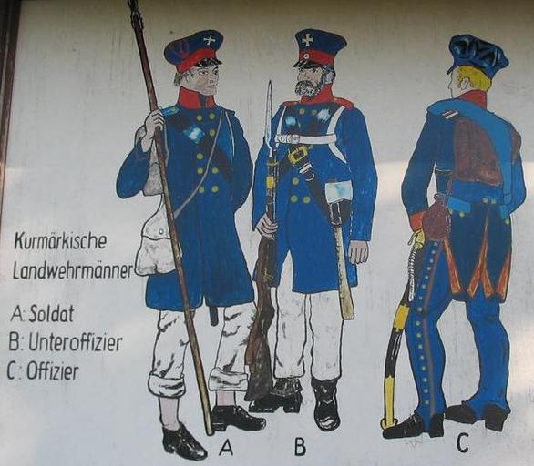 Keywords: Hagelberg D1 Battle.JPG Kurmärkische Landwehrmänner Schlacht bei Hagelberg 1813 Das Dorf Hagelberg ist ein Ortsteil der Kreisstadt Belzig im Landkreis Potsdam-Mittelmark und liegt im Naturpark Hoher Fläming Zwei Denkmäler erinnern an die Schlacht von 1813 in den Befreiungskriegen und den Sieg preußischer und russischer gegen napoleonische Truppen Prussian žLandwehrmänner militia men Battle nearby Hagelberg 1813 The village Hagelberg is a part of the town Belzig in the district Potsdam Mittelmark federal state of Brandenburg Germany The village appertains to the Nature Park Hoher Fläming Two monuments on Hagelberg hill commemorate the victory of Prussian and Russian troops in the žBattle of Hagelberg in 1813 against Napoleonic forces Foto Ausschnitt einer offiziellen Informationstafel der Naturparkverwaltung Hoher Fläming auf dem Gipfel des Hagelbergs Angaben zur Karte Urheber Datum werden nicht gemacht 12 October 2006 Date of the picture Lienhard Schulz took the picture Public Domain wegen de Panoramafreiheit Lienhard Schulz Military uniforms of Prussia Military peaked caps of Germany Battle of Hagelberg