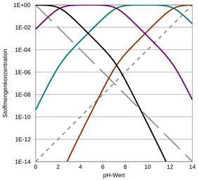 Keywords: Hägg-Diagramm Phosphorsäure.svg Hägg-Diagramm von 1-molarer Phosphorsäure in Wasser Konzentrationen H<sup>+</sup> gestrichelt; OH<sup> ˆ’</sup> gepunktet<br /> H<sub>3</sub>PO<sub>4</sub> schwarz; H<sub>2</sub>PO<sub>4</sub><sup> ˆ’</sup> violett; HPO<sub>4</sub><sup>2 ˆ’</sup> blau; PO<sub>4</sub><sup>3 ˆ’</sup> braun own Leyo 2009-01 Leyo Verwendete pK<sub>a</sub>-Werte 2 161 7 207 12 325 Speciation diagrams Phosphoric acid ImageNote 1 131 8 27 20 474 429 2 pKa-Wert 2 161 ImageNoteEnd 1 ImageNote 2 263 9 29 21 474 429 2 pKa-Wert 7 207 ImageNoteEnd 2 ImageNote 3 402 11 26 17 474 429 2 pKa-Wert 12 325 ImageNoteEnd 3