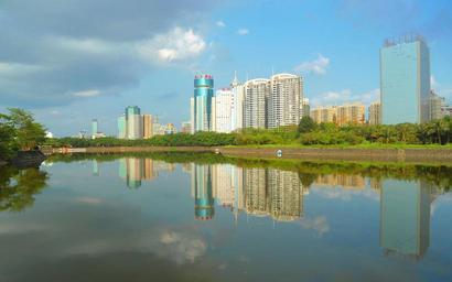 Keywords: haikou china buildings city skyline skyscrapers sky clouds river water reflections trees shoreline outside