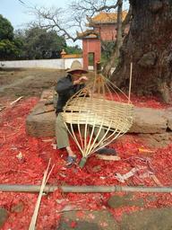 Keywords: hainan china man basket-weaving making work artistry outside trees buildings weaving