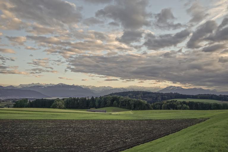 Keywords: hair dryer alpine train clouds distant view arable meadow forest lake panorama