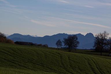 Keywords: hair dryer landscape mountains alpine upper bavaria autumn trees blue grey haze distant view sky nature arable agriculture