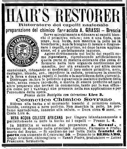 | Keywords: Hairs-restorer-Grassi-Brescia-1886.jpg it Inserzione pubblicitaria del chimico A Grassi di Brescia del 8 5 1886 su la Gazzetta Provinciale di Bergamo Italia - Hair restorer - ristoratore dei capelli nazionale Gazzetta provinciale di Bergamo 8 5 1886 A Grassi Brescia 8 5 1886 it HAIRS ™S RESTORER Ristoratore dei capelli nazionale Preparazione del chimico farmacista A GRASSI “ Brescia Serve mirabilmente a ridonare ai capelli bianchi il primitivo colore; non è una tinta non unge non lorda non macchia la pelle né la biancheria; non fa bisogno di lavare o digrassare i capelli ne prima ne dopo la sua applicazione ed è perfettamente innocuo Agisce direttamente sui bulbi dei capelli come riparatore riproducendo artificialmente quella parte di materia colorante che cessa di formarsi nella loro organica costituzione per malattia per età avanzata o per altre cause eccezionali ridonando ai medesimi il loro colore primitivo nero castagno biondo ecc impedisce la caduta promuove la crescita e la forza e dona ai capelli il lucido e la morbidezza della gioventù Distrugge inoltre le pellicole e guarisce le malattie cutanee della testa senza recare incomodo e merita di essere preferito ad ogni altro preparato che trovasi in commercio tanto per la sua efficacia come per i vantaggi che presenta nella sua applicazione e per l ™economia della spesa Prezzo della Bottiglia con istruzione LIRE 3 COSMETICO CHIMICO SOVRANO Ridona alla barba e ai mustacchi bianchi il primitivo colore biondo castagno o nero perfetto Non macchia la pelle ha profumo aggradevole innocuo alla salute - Dura circa 6 mesi - Costa Lire 5 VERA ACQUA CELESTE AFRICANA per tingere istantaneamente e perfettamente in nero la barba ed i capelli “ Prezzo L 4 In BRESCIA si vendono dal preparatore A GRASSI e trovansi in deposito nelle principali Agenzie Farmacie e Profumerie del Regno “ Si spediscono per tutta Italia franchii di porto con aumento di Centesimi 50 - Deposito in BERGAMO Goggi Grazioso chincagliere “ Vanoli Pietro profumiere “ Latini Francesco farmacista PD-old ImageNote 1 71 76 1154 1375 1291 1522 2 HAIRS ™S RESTORER Ristoratore dei capelli nazionale Preparazione del chimico farmacista A GRASSI “ Brescia Serve mirabilmente a ridonare ai capelli bianchi il primitivo colore; non è una tinta non unge non lorda non macchia la pelle né la biancheria; non fa bisogno di lavare o digrassare i capelli ne prima ne dopo la sua applicazione ed è perfettamente innocuo Agisce direttamente sui bulbi dei capelli come riparatore riproducendo artificialmente quella parte di materia colorante che cessa di formarsi nella loro organica costituzione per malattia per età avanzata o per altre cause eccezionali ridonando ai medesimi il loro colore primitivo nero castagno biondo ecc impedisce la caduta promuove la crescita e la forza e dona ai capelli il lucido e la morbidezza della gioventù Distrugge inoltre le pelicole e guarisce le malattie cutanee della testa senza recare incomodo e merita di essere preferito ad ogni altro preparato che trovasi in commercio tanto per la sua efficacia come per i vantaggi che presenta nella sua applicazione e per l ™economia della spesa Prezzo della Bottiglia con istruzione LIRE 3 COSMETICO CHIMICO SOVRANO Ridona alla barba e ai mustacchi bianchi il primitivo colore biondo castagno o nero perfetto Non macchia la pelle ha profumo aggradevole innocuo alla salute - Dura circa 6 mesi - Costa Lire 5 VERA ACQUA CELESTE AFRICANA per tingere istantaneamente e perfettamente in nero la barba ed i capelli “ Prezzo L 4 In BRESCIA si vendono dal preparatore A GRASSI e trovansi in deposito nelle principali Agenzie Farmacie e Profumerie del Regno “ Si spediscono per tutta Italia franchii di porto con aumento di Centesimi 50 - Deposito in BERGAMO Goggi Grazioso chincagliere “ Vanoli Pietro profumiere “ Latini Francesco farmacista ImageNoteEnd 1 Hair lotion advertising 1886 Advertisements in Italy 1886 advertisements in Italy |
