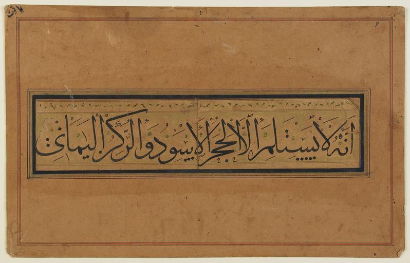Keywords: Hajj Directions WDL6835.png Artwork ru Якут аль- устасими уме в 1299 г fr Yaqut al-Mustasimi mort vers 1299 en Yāqūt al-Mustaʻṣimī died 1299 zh 雅谷特·穆塔 密,卒于 1299 年 pt Yāqūt al-Mustaʻṣimī falecido em 1299 ar ياقوت المُستعصمي، توفي 1299؟ es Yāqūt al-Mustaʻṣimī fallecido circa 1299 ru аставления относительно хаджа fr Indications pour le Haj en Hajj Directions zh 指南 pt Instruções para o Hajj ar إرشادات الحج ru В этой надписи гово ится <em> Аннаху ля ясталим иля ль-хаджа аль-асвад уа-ль- укн аль-ямани </em> Он не аз ешает это к оме как у Че ного камня и у Йеменского угла По-видимому данная ст ока является частью уководства для паломников или текста с наставлениями в кото ых гово ится что во в емя <em>тавафа</em> итуального обхода п икасаться к Каабе или целовать ее аз ешается только возле Че ного камня и Йеменского юго-восточного угла екото ые молитвы и п ошения также связаны с этими двумя углами Каабы Данная ст ока текста написана че ными че нилами к упным и четким ш ифтом сулюс  В словах указаны все огласовки а буква <em>син</em> с соп овождается т емя точками асположенными ниже ст оки с текстом чтобы ее можно было отличить от буквы <em>шин</em> ш Из ечение написано на бумаге бежевого цвета об амлено облакооб азными полосами и помещено на фон в виде облаков Его ок ужают несколько амок включая го изонтальную полосу с узо ом в фо ме листьев синего цвета Ст аница с из ечением наклеена на более к упный лист светло-ко ичневой бумаги с ка тонной основой а обо отной сто оне ф агмента находится надпись в кото ой авто ом данной ст оки называется известный каллиг аф XIII века Якут аль- устасими уме в 1296 году / в 696 году хидж ы аботавший п и дво е Аббасидов в Багдаде и пе еживший монгольские нашествия Аль- устасими писал шестью укописными стилями включая сулюс использованный в данном ф агменте есмот я на то что данный текст не подписан и возможно был дополнен в более позднее в емя вполне ве оятно что соде жащаяся в нем ст ока была написана самим Якутом аль- устасими <br>А абская каллиг афия; А абские укописи; Хаджи; Иллюмини ование укописей; Исламская каллиг афия; Исламские укописи; Паломники и паломничество fr La ligne de texte est la suivante  <em>Annahu la yastalim ila al-hajar al-aswad wa-al-rukn al-yamani</em> Il ne le permet pas sauf à la pierre noire et au coin yéménite Il semble que ce texte constitue un fragment d'un guide de pèlerinage ou d'un texte normatif indiquant que durant le <em>tawaf</em> rituel de circumambulation toucher ou embrasser la Kaaba n'est permis qu'à le pierre noire et au coin yéménite le coin sud-est Certaines prières et supplications sont aussi particulières à ces deux coins de la Kaaba La ligne de texte est exécutée en une écriture thoulouth large et nette à l'encre noire Les mots sont complètement vocalisés et la lettre <em>sin</em> s comporte trois points sous la ligne de texte pour la distinguer de la lettre <em>shin</em> sh Le texte est écrit sur du papier beige encadré par des bandes de nuages et sur fond de nuages Il est doté de plusieurs cadres comprenant une bande horizontale de motifs de feuilles bleues Il est collé sur une feuille plus grande de papier marron clair renforcé par du carton au dos Au verso du fragment apparait une note attribuant le document au célèbre calligraphe du XIII<sup>e</sup> siècle Yaqut al-Mustasimi mort en 696 après l'Hégire/1296 après J -C Actif à la cour abbasside de Bagdad il vécut les invasions mongoles Il écrivait dans les six styles de cursive notamment le thoulouth utilisé ici Bien que le texte ne soit pas signé et que certains ajouts puissent avoir été faits ultérieurement il est possible que ce fragment ait été exécuté par Yaqut al-Mustasimi lui-même <br>Calligraphie arabe; Manuscrits arabes; Haji; Enluminures; Calligraphie islamique; Manuscrits islamiques; Pèlerins et pèlerinages en This line of text reads <em>Annahu la yastalim ila al-hajar al-aswad wa-al-rukn al-yamani</em> He does not permit it except at the Black Stone and the Yemenite Corner It appears that this text comprises a fragment of a pilgrimage guide or prescriptive text that states that during <em>tawaf</em> ritual circumambulation touching or kissing the Kaaba only is permitted at the Black Stone and the Yemenite Corner the southeast corner Certain prayers and supplications also are particular to those two corners of the Kaaba The line of text is executed in a large and crisp Thuluth script in black ink The words are fully vocalized and the letter <em>sin