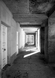 Keywords: hall lights fear perspective cemetery doors black and white door housing