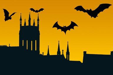 Keywords: halloween bats evening magic sunset castle tower fly microchiroptera occultism secret weird scene surreal atmosphere orange dusk