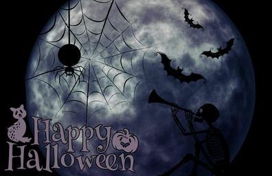Keywords: halloween skeleton cat weird surreal atmosphere creepy silhouette happy halloween